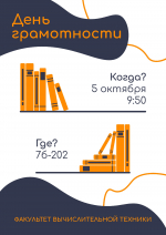 01.10.2020 21:13 5 октября в 9:50 в ауд. 7б-202 пройдёт 10 юбилейный «День грамотности»! Одно из старейших мероприятий факультета вычислительной техники!
